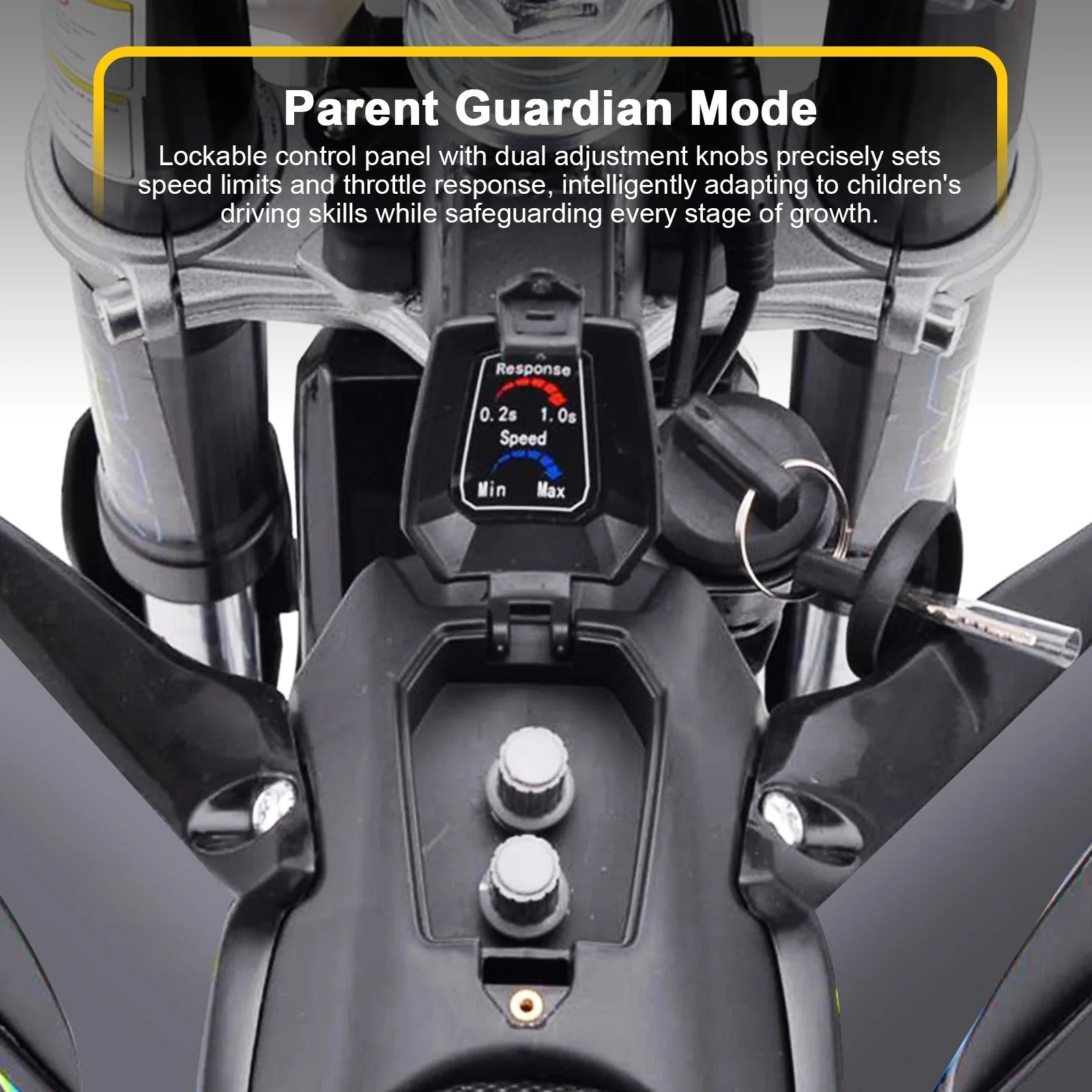 With a steel frame, IPX6 water resistance, and a padded single-rider seat, this electric dirt bike is built to withstand tough conditions while delivering a smooth, controlled ride.