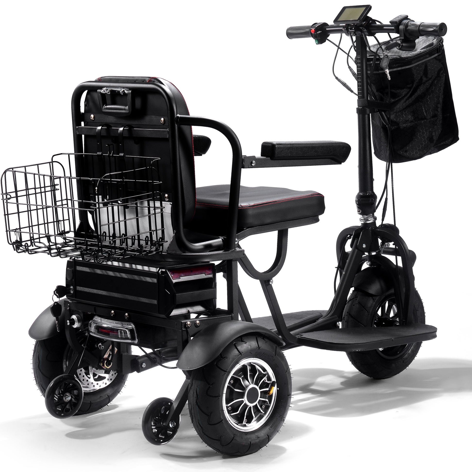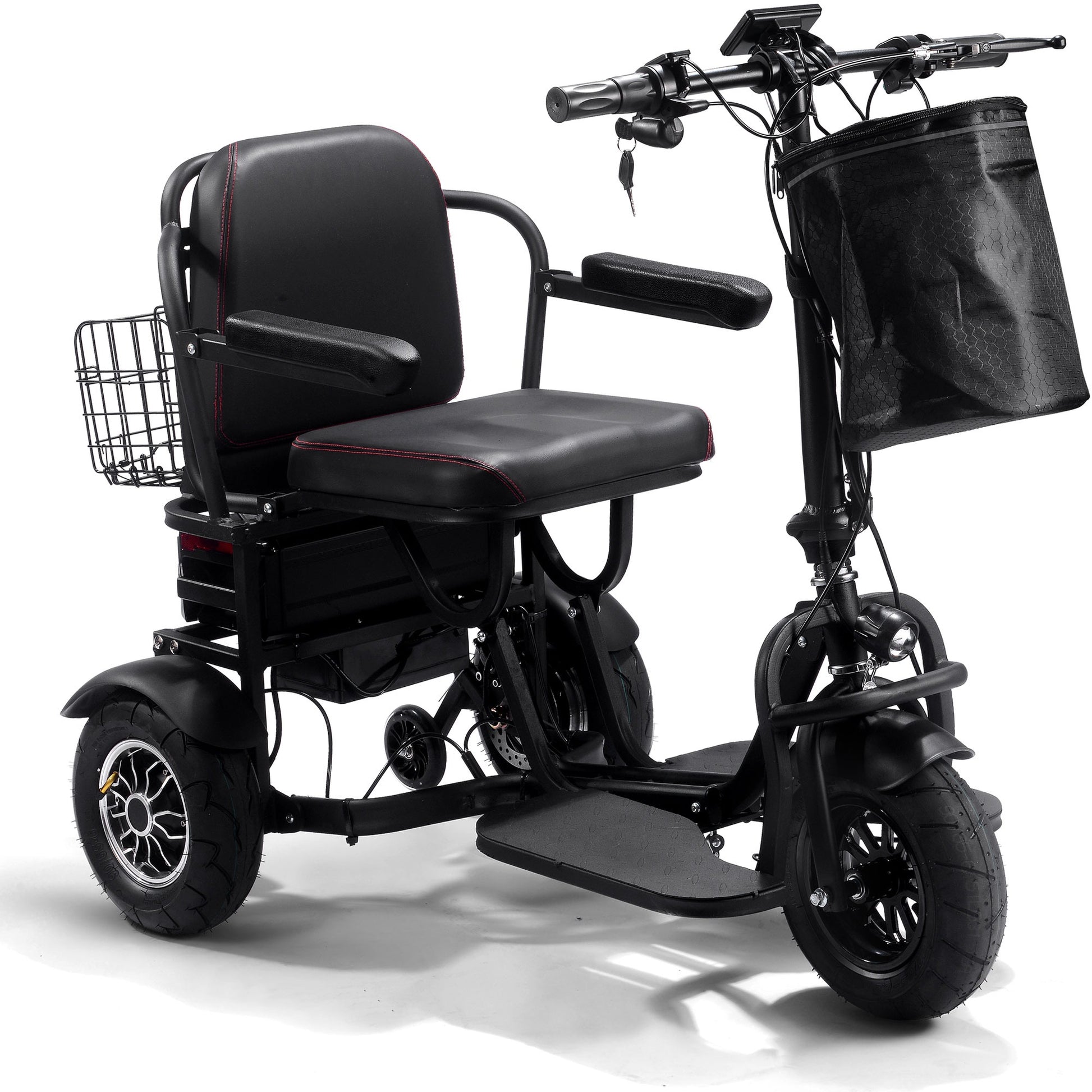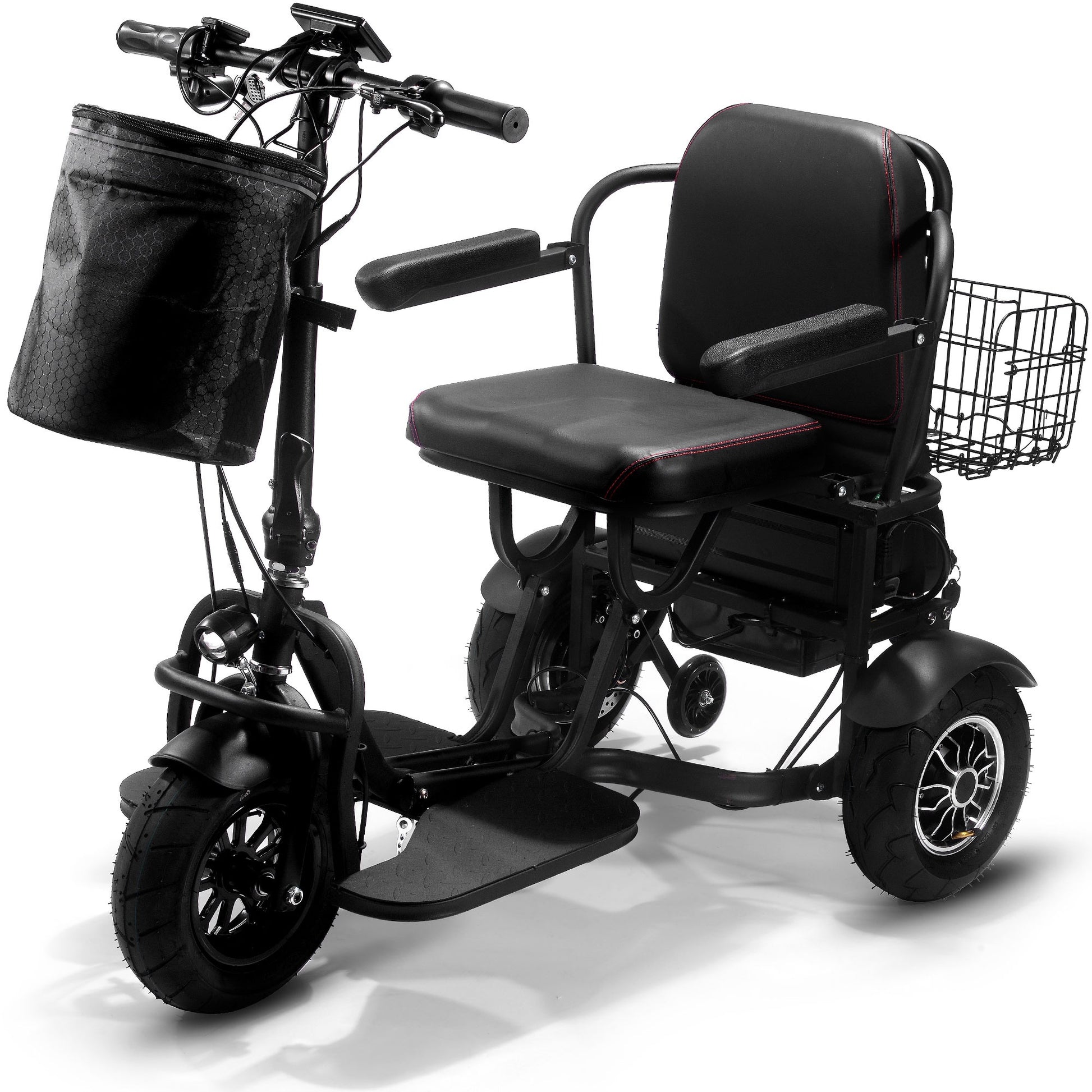 Introducing the new 1000 watt Folding Mobility Scooter by MotoTec. Its compact, three wheel styling makes for a sharp turning radius, 2 hub motors built into the rear wheels provide amazing torque for riding up inclines with its light weight durable frame made from Aluminum. The lithium battery is light weight and lasts longer than your standard competing lead acid models. Comes standard with headlight, rear light, key start, 3 forward speeds(with additional slow 2mph store speed), reverse, dual rear disk brakes, comfortable seat with arm rests and backrest, front & rear baskets and large 11 inch air filled tires to provide a comfortable ride.